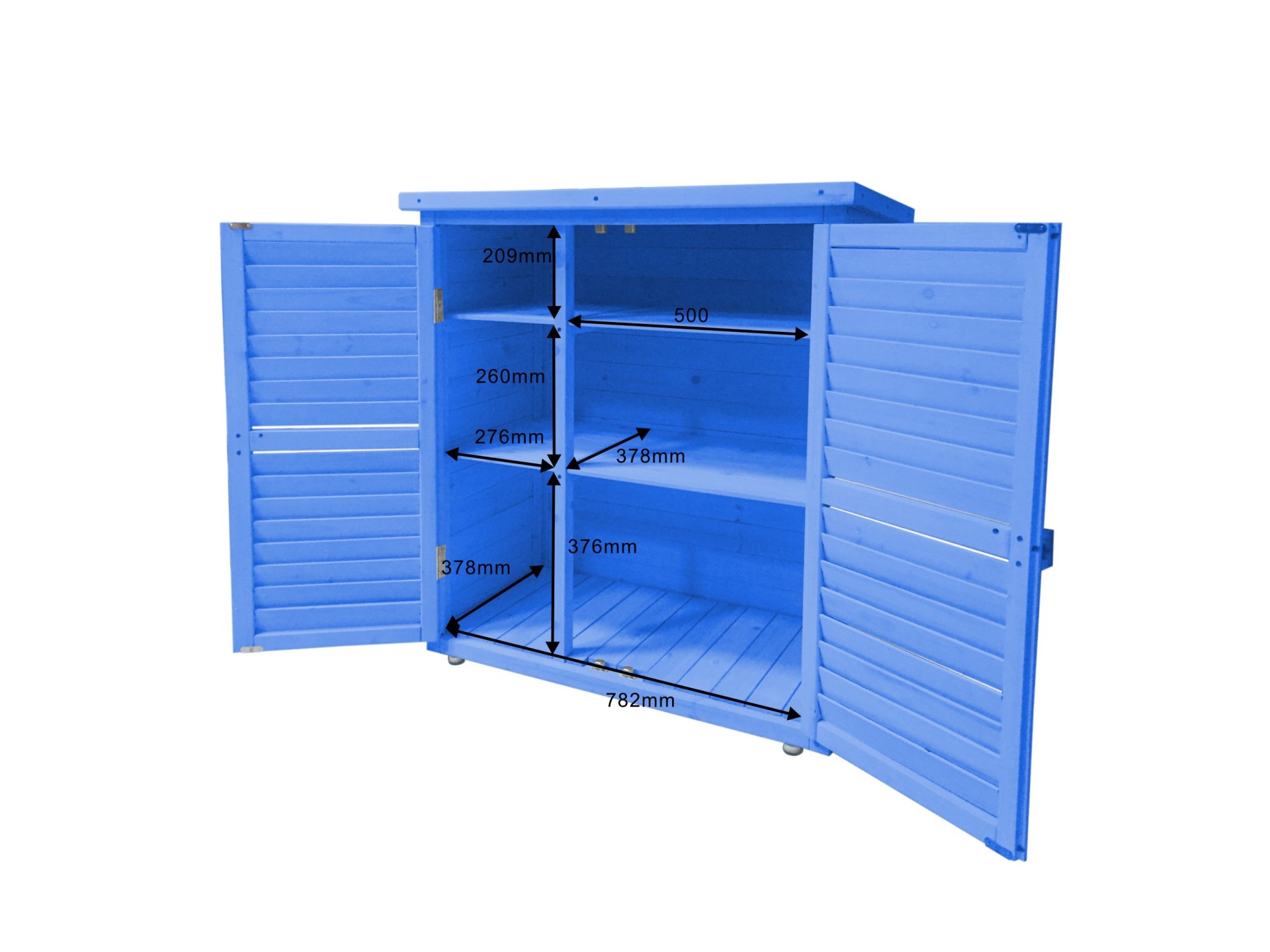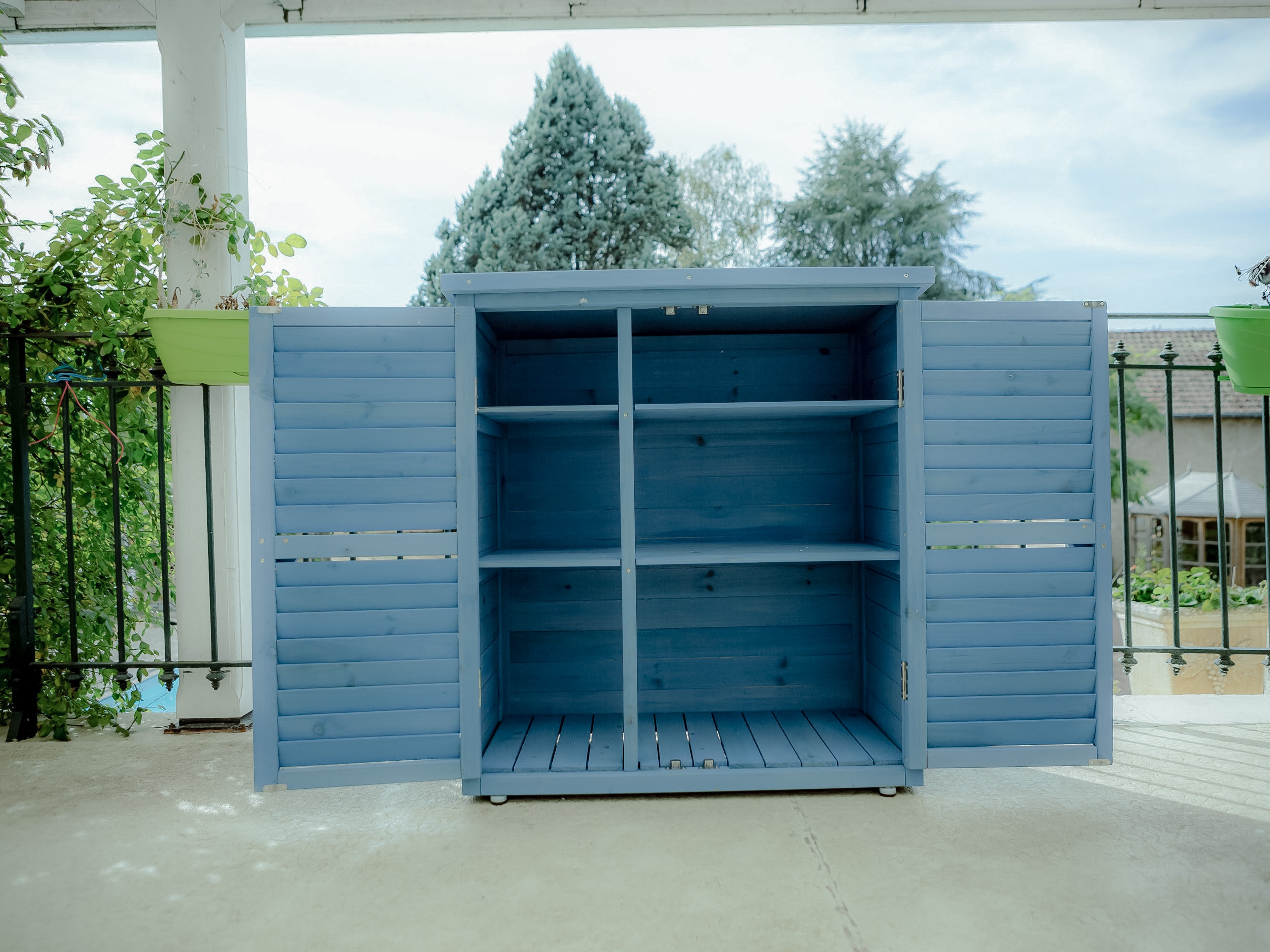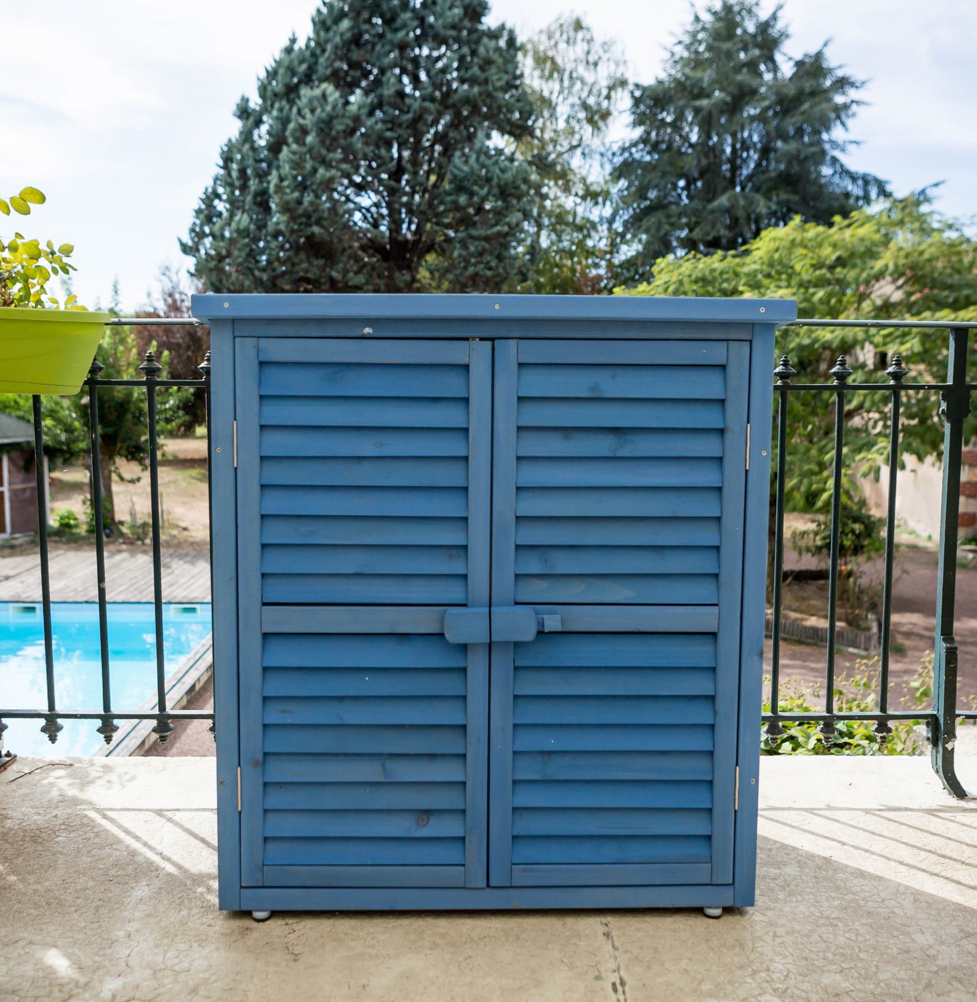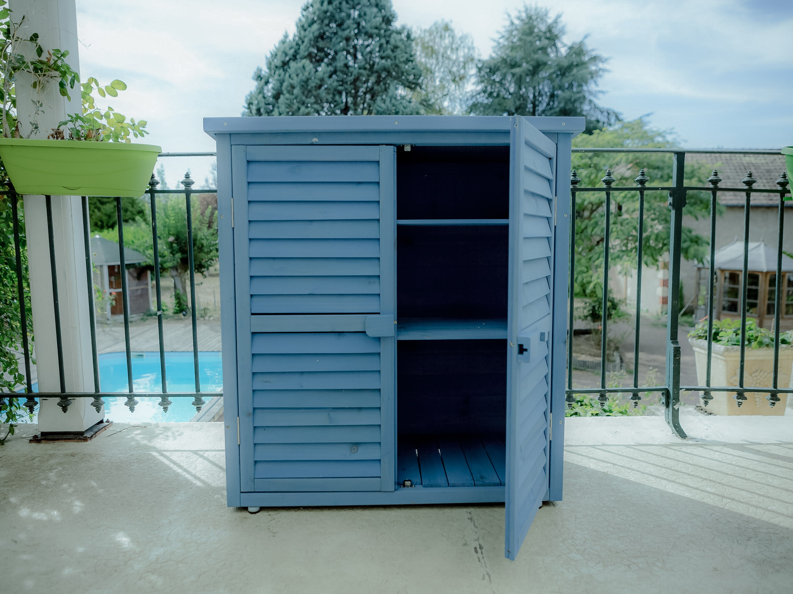Forte de son succès avec l'armoire cabine de rangement lasurée HABRITA qui a séduit un grand nombre de consommateurs dès sa sortie, FORESTA élargit sa gamme de produits de rangement pour les balcons et le jardin. La BOX 0905 est une armoire basse de rangement lasurée qui apporte à votre jardin ou sur votre balcon un grand espace de rangement pour vos outils, vos produits de jardinage, vos objets de décoration. Equipée d'un toit en pente en papier bitumé, elle saura résister à la chaleur et aux intempéries. Sa couleur bleue apporte une finition haut de gamme et permet à l'ensemble son intégration parfaite au sein d'un jardin ou sur le parvis d'une terrasse. Equipée de 2 tablettes de rangement larges et profondes, elle offre un grand espace de stockage. Ses 2 larges portes persiennées condamnables par un loquet en bois protègeront le contenu des intempéries, tout en sécurisant l'accès pour les enfants et les animaux. Simple à monter, elle saura répondre à vos besoins décoratifs tout en offrant une grande praticité et un confort de rangement.
